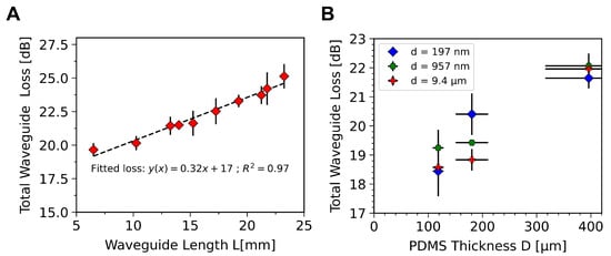 By varying the waveguide length, L, the coupling and linear losses can be extracted as the intercept and slope of a linear fit to the total loss, , with length. As seen in Figure 3A, for a 400 m thick waveguide with an output coupling grating area of 10 × 3 mm, a coupling loss of 17 dB is measured, with a linear loss of 3.2 dB/cm. This is consistent with other work on PDMS waveguides, which show linear losses of 3.1 dB/cm at 532 nm [46]. Details of these and future measurement procedures can be found in Appendix B below.