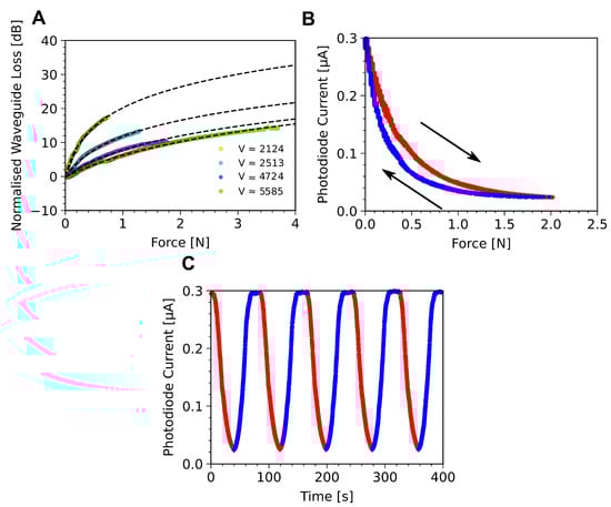 (A) Waveguide response for several normalised frequency values, V, calculated from Equation (1). Yellow: D = 180 m, m; Blue: D = 180 m, m; Magenta: D = 400 m, m; Green: D = 400 m, m; The black dashed lines show logarithmic fits to the data of the form , where x is the compression force and a, b, and c are freely varying fitting parameters. (B) Curve of the photo-current versus the compression force for a single compression force cycle, red is increasing compression force, blue is decreasing compression force. Loading and unloading achieved with a linear compression rate of 5 mm/min. The hysteresis seen has an integrated area of 37 nA·N for a single loading cycle. (C) Photo-current over time as compression force is applied with a 20 s pause between cycles, red and blue data correspond to part (B).