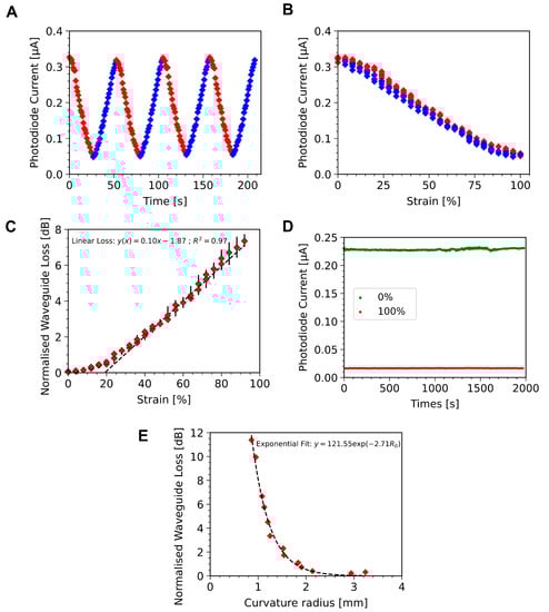 (A) Photo-current over time for four stretching cycles between 0% and 100% for a single device. (B) Photo-current against strain over four stretching cycles, stretching shown in red, relaxing in blue. Hysteresis is evaluated at around 10% for the same devices as (A), with an integrated current of 2.71 A·% over a single strain cycle. (C) Calculated power loss in the waveguide with strain averaged over 4 cycles for the same device a (A), showing a linear increase in loss with strains above 20%, represented by the fitted straight line, dashed black. Error bars show the spread of data over four loading and unloading cycles of a single device. (D) Measured photo-current from a new device over 100 cycles of stretching from 0% to 100%, current at 0% stretch in green and 100% stretch in red. (E) Calculated power loss in a 400 m thick waveguide with bending radius (red diamonds) and fitted exponential decay curve (dashed black line).