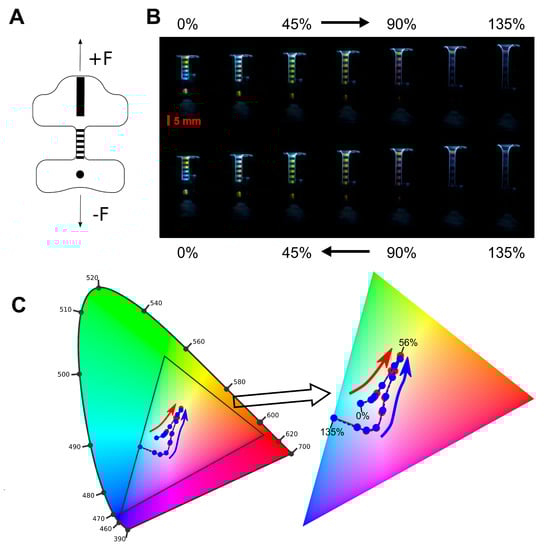 Further, the angle of the incident light wavefront is 90 to the normal of the grating, and the 1st mode is considered, . Since the refractive index of the out coupling region is , the angle of out-coupled light now follows . Since stretching increases the value of , this should cause an increase in . To investigate this, a new waveguide was fabricated, incorporating five additional out-coupling gratings along the length of the guiding core, seen in Figure 6A, each with an area of 1 × 5 mm. A broad spectrum, white light LED was placed at the input grating of the waveguide. A CCD camera was located 60 above the system, used to capture images of the out-coupling gratings for applied strain. Figure 6B shows the change in colour at the out-coupling grating for strains between 0% and 135%. A clear change in colour at the output is seen in the figure, as well as good reversibility as the strain is relaxed. Figure 6C shows the change in colour through RGB analysis of these images. It can be seen that there is a clear, highly reversible shift in the grating colour with stretching.