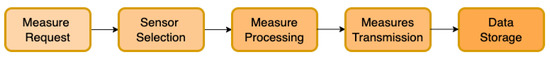 Figure 1 shows the operative stages of the system to perform a measurement. Considering a rack of servers, once a measurement is requested, the system needs the ability to select the correspondent sensor, perform the measurements required, and introduce them into packets for the transmission of data until the storage stage. In this work, a local server that saves the measurement data is used, even if more technologies could be adopted for this stage (cloud, remote server, etc.). Even if this study focuses on data centers and server farms, it could be adapted to any scenario that needs a system that can monitor a large number of devices. To provide energy measurements to the system, several solutions need to be analyzed.