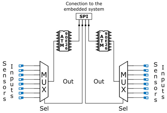 A possible measurement strategy is also represented by the use of two ATM90E26 to connect up to 16 sensors. Moreover, having two chips could improve the measurement speed because when one chip is performing the measurement, the other chip is selecting the connection to the sensor.