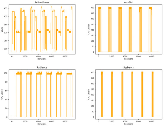 Figure 12 shows a set of graphs obtained running a complete Phoronix test. Specifically, the top left Active Power figure summarizes the CPU power consumption during a complete battery of tests that fluctuates depending on the charge CPU peak of the different tests. The remaining figures introduce a graphic for each benchmark showing the corresponding CPU usage details.