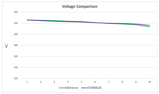 Figure 13 presents the voltage measurement comparison between the reference and the ATM90E26 PCB. It is possible to observe that even if the AC transformer introduces a low error percentage, the ATM90E26 measures follow the reference.