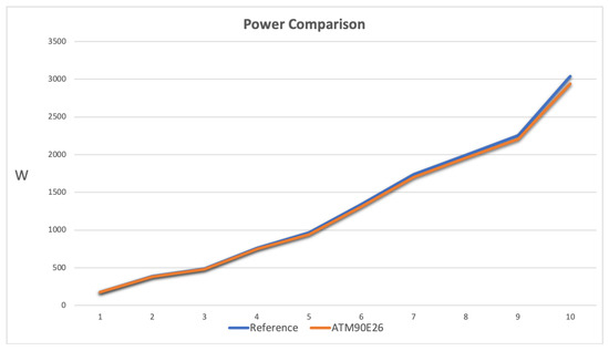 Figure 15 represents the power measurement comparison for a single channel of the prototype. The ATM90E26 curve should be a mixture of current and voltage characteristic, but in this case, as the current excursion is greater than the voltage excursion, the curve is similar to Figure 14, where ATM90E26 follows the reference when the current measure is in the range and reduces its trend outside the range.