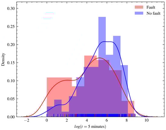 Distribution chart of the last operating cycle time registered for runs with and without faults. The time cycle scale was converted to the logarithmic scale in order to better show the distribution of the variable. The average maximum cycle time of failed runs is less than that of normal operations. The distribution of both presents a bimodal characteristic, with two different concentration points more clearly verified in the faulty series.