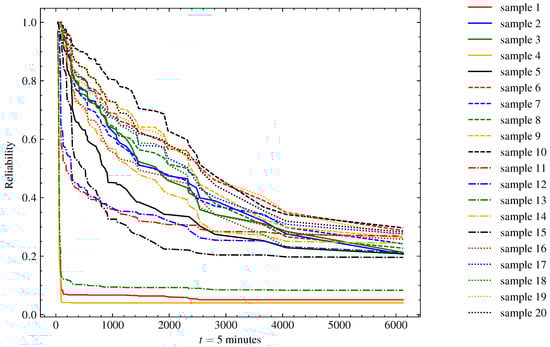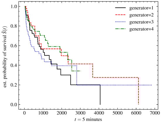 The runs were considered independent, given that the systems could be turned off for a long time and undergo modifications, such as routine maintenance, during this period, and because machine start-up is the biggest cause of system deterioration. For this reason, the Kaplan–Meier model was adjusted and presented in order to describe the survival function of each run of the four generators in Figure 2.