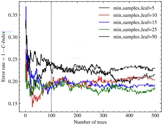 where represents the cumulative hazard function estimation of jth survival trees in the ensemble and M is the total number of survival trees. The base estimator hyperparameters were chosen from the convergence analysis performed on our data (shown in Figure 4). We used the parameter of the number of base estimators , as it was a value close to the smallest error observed. For the minimum value of the samples in each node, the value adopted was 15 samples, selected because it presented the lowest error for ensembles with 100 trees.