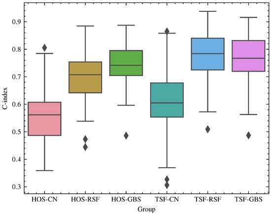 From the box plot analysis, we observed that the HOS-CN group obtained the lowest accuracy, while the TSF-RSF and TSF-GBS groups obtained the highest accuracies. The variance of CN was higher than those for the other survival models, especially when adopted with TSF feature engineering.