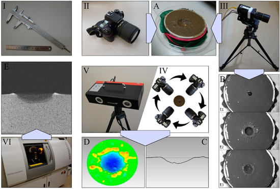 Measurement equipment and methods of analysing data acquired with its help. Measurement equipment: (I)–basic manual measurement methods using, among others, a ruler or calliper; (II)–camera; (III)–high-speed camera; (IV)–devices making it possible to record images for photogrammetry (e.g., cameras); (V)–surface scanners and profilometers; (VI)–computed tomograph. Data analysis methods: (A)–photo analysis; (B)–record analysis; (C)–profile analysis; (D)–3D surface model analysis; (E)–tomographic image analysis.