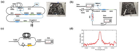 The experimental setup of the distributed feedback (DFB) laser with the SIL is shown in Figure 1a. The 980 nm pump was launched into the DFB through a wavelength-division multiplexer (WDM1). The backward signal was injected into the following amplifier through an isolator (ISO), an optical coupler (OC1, 99:1), and WDM3. The residual pump from the DFB was drawn from WDM2 and used for the following amplifier. The external resonator was composed of a variable optical attenuator (VOA1) for the injection power adjustment, a single-mode fiber (SMF) with a length of 20 m for high Q value, and an OC2 with a coupling ratio of 1% for the injection power detection. The amplified spontaneous emission from the amplifier was removed by the fiber Bragg grating (FBG), and the reflection spectrum of the FBG is shown in Figure 1d. The central wavelength and 3-dB spectral bandwidth are 1550.1 nm and 0.19 nm, respectively. Figure 1b illustrates the experimental setup of the BEFL. The output lasing from Figure 1a provided the Brillouin pump (BP) for the BEFL through a circulator (CIR2). The OC3 with a coupling ratio of 5:5 was used for the measurement of BP. The VOA2 was used to adjust the BP power. A 1-m-long erbium-doped fiber (EDF2, LIEKKI Er-80) was pumped by the second 980 nm LD through the WDM4 to act as the gain media for the BEFL. The tunable optical filter (TOF, Santec OTF-320) with a 3-dB bandwidth of 0.8 nm was used to suppress the self-excited oscillation of BEFL. The lasing was emitted from the OC4 with a coupling ratio of 30%.