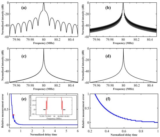 Figure 3a–d illustrates the simulated self-heterodyne spectrum of the DSHI, when the delay time is 0.006-, 0.06-, 0.6-, and 6-times laser coherent time, respectively. When the delay time is short, the main energy of the self-heterodyne spectrum will focus on the central pedestal as described in Equation (2). The central pedestal will narrow with the delay time increase and shift the energy to the modified Lorentzian part as described in Equation (3), as shown in Figure 3a–c. The self-heterodyne spectrum will evolve into a standard Lorentzian lineshape under sufficient delay time, as shown in Figure 3d. According to Equation (4), the intensity of the sine function will decrease with the delay time increasing, as shown in Figure 3a–c. The pedestal and the sinusoidal jitter can be regarded as caused by the measurement error since they cannot be eliminated unless the delay time is greater than six times the laser coherent time [23], as shown in Figure 3d. Figure 3e,f shows the relative measurement error with different delay time. The laser linewidth was calculated from the 3-dB and 20-dB bandwidth of the self-heterodyne spectrum. The peaks in Figure 3e are related to the sinusoidal jitter, as shown in the inset. According to Figure 3e,f, the relative measurement error can be ignored when the white noise linewidth is calculated by the 20-dB bandwidth and the delay time is close to the laser coherent time. However, the coherent time of a narrow-linewidth lasing is quite long, which means the flicker noise will become prominent when the delay time approaches such a long coherent time. At this time, the self-heterodyne spectrum can be recognized as the convolution of the flicker noise (wide Gaussian lineshape) and white noise (narrow Lorentzian lineshape), which makes it difficult to obtain the white noise linewidth (Lorentzian linewidth).