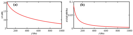 where ΔS is the CDSPST, c is the light speed, n is the refractive index, f is the Lorentzian linewidth of the under-test lasing, and L is the delay fiber length. From Equation (6), the ΔS changes slightly when the wide-linewidth lasing is under test. The variation will be even lower than the intensity resolution of the ESA. Figure 5 illustrates the CDSPST and variation rate curves versus the under-test laser linewidth. It can be recognized that the CDSPST has a negative correlation with the laser linewidth. The variation rate decreases rapidly with the laser linewidth increasing, which means that only the narrow laser linewidth can obtain high measurement precision.