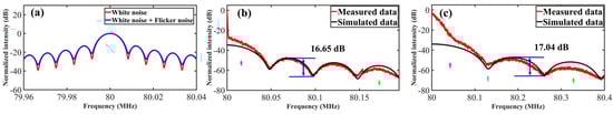 A long delay fiber will cause a larger Lorentzian linewidth value than reality because the prominent flicker noise improves the trough intensity and results in a smaller CDSPST, as shown in Figure 6a. However, a short delay fiber will also lead to a measurement error due to the weak trough intensity which may touch the dark noise of the ESA. Hence, the delay fiber with appropriate length is key to accurate linewidth measurement in the SCELD. The self-heterodyne spectrum of the SIL laser under maximal injection power was measured by the SCELD with a 4.168 km delay fiber, as shown in Figure 6b. The ΔS is 16.65 dB corresponding to the product fL of 2.449 MHz∙m and the Lorentzian linewidth of 587 Hz, which is slightly smaller than 750 Hz in Figure 4c as expected. The simulated self-heterodyne spectrum shows high consistency with the experimental results except for two mismatch regions, which ensures the measurement precision of the linewidth. The first mismatch region near 80 MHz (marked by the pink arrow in Figure 6b) is due to the omission of S1 during simulation, and the second mismatch region beyond 80.15 MHz (marked by the green arrow in Figure 6b) is due to the black noise of the ESA. The second mismatch also indicates that the delay fiber length cannot be reduced for the laser under test due to the dark noise of the ESA. The self-heterodyne spectrum of BEFL was measured by the SCELD with a 14.3 km delay fiber, as shown in Figure 6c. The ΔS is 17.04 dB corresponding to the product fL of 2.233 MHz∙m and the Lorentzian linewidth of 156 Hz. The simulated self-heterodyne spectrum shows a large mismatch with the experimental results, which means a large measurement error. The first mismatch region near 80 MHz (marked by the pink arrow in Figure 6c) and the second mismatch region beyond 80.3 MHz (marked by the green arrow in Figure 6c) are caused by the same reason in Figure 6b. The mismatch (about 5 dB) at the first trough (marked by the blue arrow in Figure 6c) is due to the flicker noise which cannot be filtered out with such a long delay fiber of 14.3 km. From Figure 6c, neither a longer nor shorter delay fiber is available for the linewidth measurement of BEFL with SCELD due to the flicker noise and dark noise.
