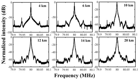 An excessively long fiber is not suitable for obtaining a self-heterodyne spectrum since it will lead to a large power loss and strong nonlinearity. However, a short delay fiber may cause an additional error, such as a prominent pedestal and strong sinusoidal jitter. In order to find out a proper delay fiber length for the Lorentzian linewidth measurement of the BEFL, the self-heterodyne spectra of the BEFL with different delay fiber lengths were measured, as shown in Figure 7. The results illustrate that the central pedestal narrows with the delay fiber increasing, and finally vanishes when the delay fiber is 20 km. The vanishment of the central pedestal implies that the self-heterodyne spectrum can be accurately fitted with the Voigt curve.