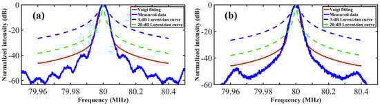 The self-heterodyne spectrum of the BEFL measured by the DSHI (20 and 50 km) and the fitted curves are presented in Figure 8a,b. The Voigt fitting curves reproduce the self-heterodyne spectrum well and the Lorentzian linewidth is confirmed to be 60 ± 5 Hz. The results show that a self-heterodyne spectrum without the central pedestal is an indispensable element for an accurate narrow linewidth measurement.