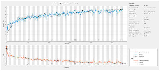 - VGG-16 is a sixteen-layer deep neural network with about 138 million parameters. This implies that it takes a long time to be trained and to make an inference. It also occupies a significant amount of memory (roughly 533 MB). Despite this, it has been used in several image classification problems, and in terms of performance, it provided the best result with a test error of about 7.0%. [114,115]. The main design idea was to increase the depth by using smaller (3 × 3) multiple convolutional filters than those of previous networks. VGG-16 is composed of a stack of 13 convolutional layers followed by three fully connected layers. Each convolutional block consists of multiple convolutional layers, each with different 3 × 3 filter kernels. As the depth increases, the number of filters in the levels grows, from 64 up to 512, in order to extract increasingly detailed feature maps from each block. The convolutional layers are followed by a rectified linear unit activation layer, and each block ends with a maximum pooling layer, with a 2 × 2 sliding filter with step 2. At the end of the network, there are three fully connected layers: the first two layers have 4096 nodes each; the third performs the 1000-way ILSVRC classification and, therefore, contains 1000 output nodes. This final layer comes with a soft-max activation function for classification. Since VGG-16 is computationally demanding and the output layer does not match our case study, we customized it by modifying the last layer. We set the number of output nodes equal to the number of classes that we have defined in our use case (4, as we will describe later in the next section). As a final step, we froze the first ten layers, and we performed new training to learn new network weights for the last layers.