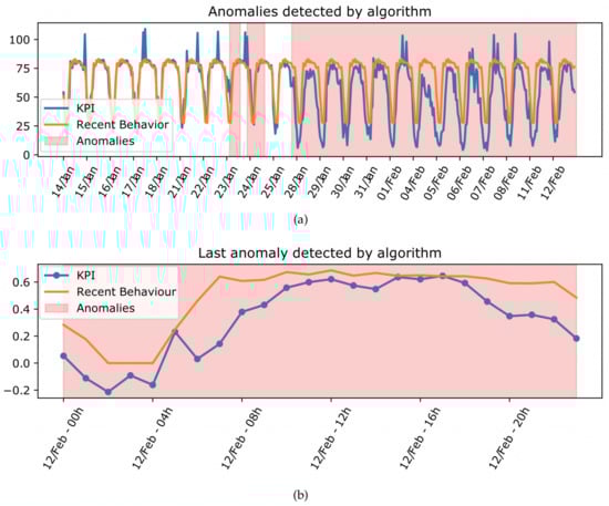 First of all, the Results block represents the anomalies in a simple way, with the help of the graphs presented in Figure 2. Specifically, Figure 2a shows the history of the data analyzed, highlighting the intervals with anomalies detected by the algorithm. Figure 2b shows the anomalous intervals since the last execution of the active learning loop proposed in the methodology.