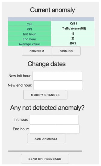 In this case, interface II is responsible for formatting and extracting useful information from each anomalous interval detected by the algorithm. Specifically, the following information is obtained for each interval: start and end dates of the anomaly, anomalous KPI, mean value if the behavior was normal, and mean value observed in the interval. These data are displayed in the interface of Figure 3, which the expert uses to express his opinion about the anomalies. In addition, to facilitate the graphical representation of the anomalies, the values of each KPI analyzed in the network are also extracted, both historically and since the last iteration, as well as the usual behavior. Instead, these data and graphs are used by the results block, as in Figure 2 to show more simply the anomalies to the expert.