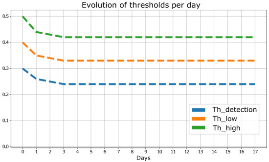 Secondly, it is observed how the proposed methodology fine-tunes the values of the thresholds according to the knowledge acquired by the expert as shown in Figure 5. The trend of these thresholds illustrates how the values are approaching the target values described above, thus reaching an optimal configuration of the detection algorithm.