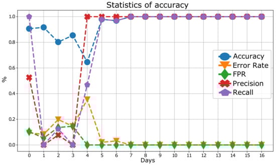 Figure 6 depicts the obtained enhanced performance in statistical terms. The accuracy achieved by the algorithm is close to 100% after an initial period that is coincident with the period in which the most changes are made to thresholds. On the other hand, the Error Rate and FPR values remain at minimum levels after this period of threshold readjustment. In this sense, the values of Recall and Accuracy also reach 100%, achieving remarkable results and leading to an almost perfect optimization of the thresholds of the detection algorithm and, therefore, of its performance.