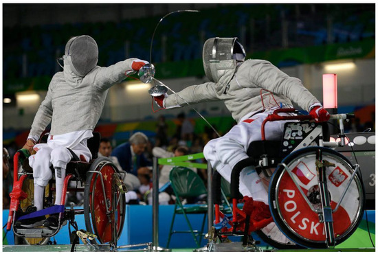 - Chung, W.M.; Yeung, S.; Wong, A.Y.; Lam, I.F.; Tse, P.T.; Daswani, D.; Lee, R. Musculoskeletal injuries in elite able-bodied and wheelchair foil fencers—A pilot study. Clin. J. Sport Med. 2012, 22, 278–280. [Google Scholar] [CrossRef]