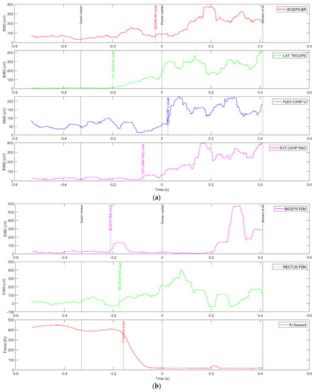 The analysis of the muscle activation sequence in Figure 3a,b shows a clear trend of anticipatory activation of the LAT GAS and MED GAS muscles of the rear leg. Only slightly later is the TB muscle activated, followed by the ECR, BB, and FCU muscles. Characteristically, the arm and forearm extensors are activated. More importantly, there is a specific synergy of the gastrocnemius muscles with the vertical ground forces. During the movement phase, the FZ rear is approximately 600 N and the MED GAS is approximately 100 μV. During the actual movement time, the FZ rear was at approximately 800 N max, while the EMG was approximately 250 μV max relative to the LAT GAS.