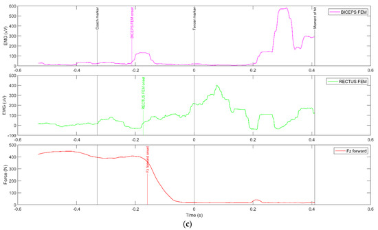 When performing a lunge, the coordinated activity of all limbs can be observed, with the non-attacking arm playing the smallest part since it only assists in maintaining balance after a hit is placed on the opponent’s body. The main importance is attributed to the rear leg and the dominant sword arm. As shown in Figure 3b,c, the RF and BF muscles of the front leg are activated later than the muscles of the rear leg; however, in a certain synergy with the peak of the vertical force Fz for the front leg. During the dynamic straightening of the rear leg, the front leg is lifted off the ground, and during extension, the RF muscle (approximately 400 μV) is first activated as an extensor followed by the BF muscle (approximately 800 μV) just before the hit. Characteristically, both the RF and BF muscles reach their activation peaks following the fencer’s blade movement (Fencer marker). At this point, the Fz force of the front leg fades because just before the fencer’s blade movement the fencer’s front leg leaves the ground force reaction platform. It should be noted, as shown in Figure 3c, that the fencer’s front foot presses the platform anticipatively while still in the pre-motor phase of performing the lunge, which generates a significant amount of vertical force.