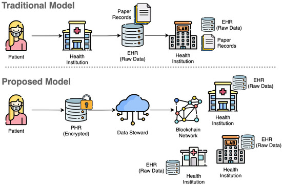 A personal health record (PHR) includes health information managed by an individual [1,2], while an electronic health record (EHR) is managed by the clinician and/or health-care institutions [3,4]. Personal privacy is a major concern in healthcare; therefore, in the context of PHR, individuals control the data and grant permission for access to third parties [5]. Healthcare institutions must comply with regulations, such as the Health Insurance Portability and Accountability Act (HIPAA) in the United States of America or the General Data Protection Policy Regulation (GDPR) in Europe [6]. Health institutions may face conflicts of interest when they, in addition to providing health care for patients, can also earn benefits, including financial gains, from data aggregation and provisioning [7,8,9].