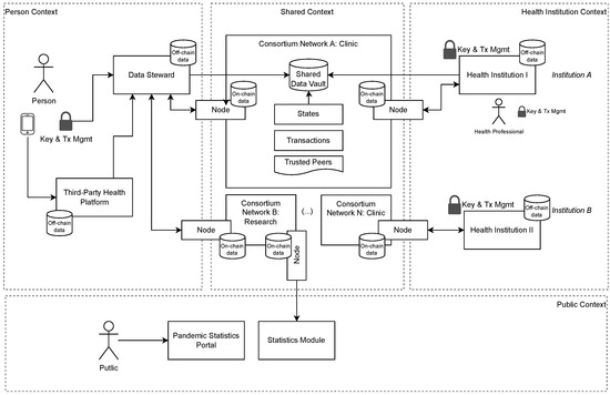 - The shared context is dedicated to exchanging data from personal and health institution contexts using the distributed network for data (IPFS) and metadata (blockchain).