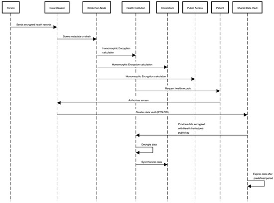FHE allows the system to execute mathematical operations on the encrypted data. Therefore, all data should be in the numeric array format for the FHE calculations. In the case of raw data, access management should be presented in the form of a sequence diagram, as shown in Figure 4: