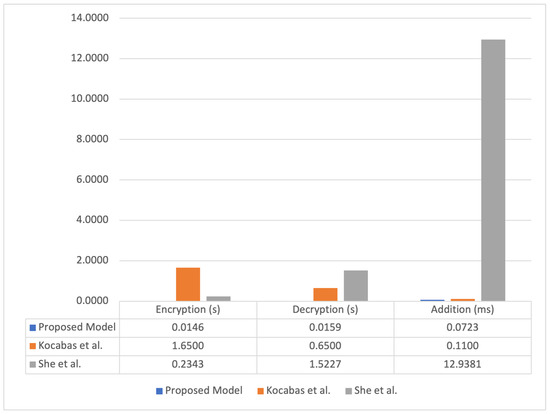 We analyzed the performance and profiling results of Kocabas et al. [29], and our proposed model obtained better results. Many factors influence this difference. In the study conducted by Kocabas et al. [29], BGV is the FHE algorithm, whereas our model uses the BFV algorithm, which is an evolution of the BGV algorithm. The payload in each round in the study conducted by [29] was an array of 200 ECG records, and we computed a binary value . Finally, the hardware used in the previous study [29] was a dual-Xeon E5450 node of 16 GB RAM and quad-cores @3GHz, while we used an Apple M1 8 Core of 3.2 MHz and 16 GB RAM.