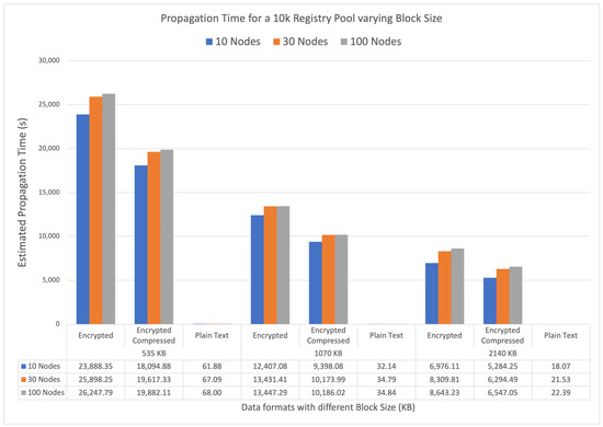 Blockchain network simulation: 10,000 pool size with block header of 500 B and block time of 5 s. Different scenarios compare different block sizes (535, 1070, and 2140 KB) in three formats (plain text, encrypted cyphertext, and compressed and encrypted cyphertext) with 10, 30, and 100 nodes distributed in three different regions. The chart depicts the time in seconds for 10,000 registries to propagate in the network.
