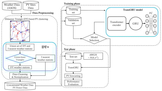 Figure 1 shows the overall process of the proposed framework called DTTrans and its three steps: data preprocessing, training phase, and test phase. In the first step, PV sites are clustered based on the Delaunay triangle to identify which weather stations enclose each of them. After that, a union set of identified weather stations is fed into a rule-based selection algorithm called Union-Inner Triangles in order to select three highly relevant weather stations in an adaptive way. This process extends the vanilla Delaunay Triangulation to DT+, as shown in Figure 1. The dataset is then split into a training set, validation set, and test set. In the second step, the proposed TransGRU model is trained by the training set, and the hyperparameters of TransGRU are determined by the validation set. In the final step, we estimate the performance for the test set for various cases.