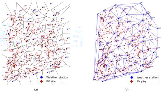 where is a distance metric. Equation (2) is about how the Voronoi cell is constructed. Arbitrary point p and seed points are on the same plane, which are the locations of the PV power plant (subspace of p) and weather station in our case. Under this status, the distance between p and seed point (e.g., ) is calculated and compared with other seed points to find which seed point is closest. Hence, serves as the closest weather station to any points in . A set of Voronoi cells is called the Voronoi Tessellation (VT) (or Voronoi diagram) of and denoted by: