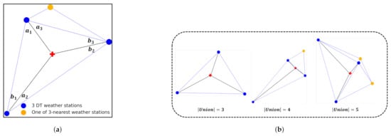 Extension of DT to DT+ using union-inner triangles algorithm. (a) Union-inner triangles. (b) Cases for the union set of DT weather stations and 3 nearest weather stations.