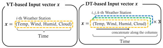 We now make vectors and , which are the input and output of our TransGRU model. Let represent the hourly time-series values. has 4 meteorological factors (temperature, wind speed, humidity, and cloud) per weather station during a day. By contrast, has hourly PV generation during a day. Figure 4 shows the form of the input vector based on VT and DT.