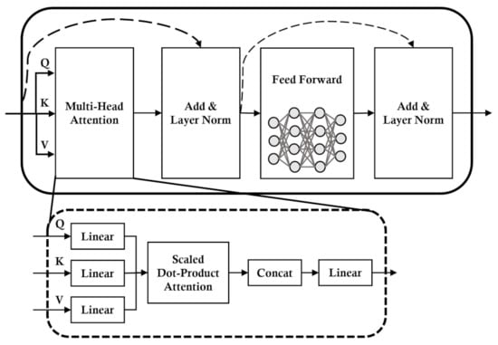 The Transformer encoder is a part of the Transformer, which is a well-known model in machine translation [34]. In the Transformer encoder, as shown in Figure 5, multi-head attention is the main technique. Instead of a single attention function with queries, keys, and values, multi-head attention linearly projects the queries, keys and values. Furthermore, multi-head attention allows the model to attend to different representations at different positions from the number of heads, denoted by h. We use a single Transformer encoder layer and a single head (i.e., ), which is single self-attention. Thus, we have multi-head attention as follows by using the same notations in [35]: