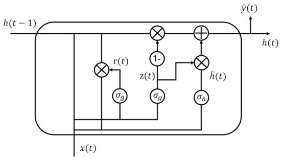 Gated recurrent unit (GRU) is a well-known RNN model, which is slightly different from a long short-term memory network (LSTM). It uses reset gate and update gate to solve the long-term dependencies of different time scales and takes the sum between the newly computed state of the data and the existing hidden state to solve the gradient vanishing problem. GRU has fewer parameters than LSTM since it has only two gates. In [36], the authors showed that GRU has fast convergence compared to LSTM while maintaining the performance of LSTM in certain tasks, depending on a dataset. We also find that the performance of GRU and LSTM is similar, so either can be a flexible choice for recurrent neural networks, and we choose GRU considering model complexity. Figure 6 shows the architecture of the GRU unit. The relationship between the input and output of GRU can be described as follows: