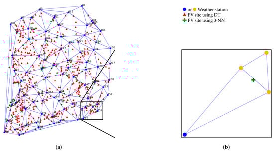 Recall that we proposed the union-inner triangles algorithm in Section 2.3 to extend the Delaunay triangle-based weather station selection; the target PV site can use either DT weather stations or the three-nearest weather stations. In the experiment, we found that DT weather stations and the three-nearest weather stations are the same for 348 PV sites out of 1034 PV sites, but different for the rest of the 686 PV sites. As shown in Figure 3, the number of PV sites for the size of the union set is determined as for 348 PV sites, for 528 PV sites, and for 158 PV sites. In our case, none of the PV sites have . Now, it is interesting to see which one would be better for the rest of the 686 PV sites when : DT weather stations or three-nearest weather stations. In doing this, Figure 8 shows the distribution of 686 PV sites. As can be seen, 472 PV sites (i.e., red triangle symbol) show that using DT weather stations performs better than the three-nearest weather stations. We found that DT is less effective when PV sites are located in obtuse triangles or close to the side of a triangle. Figure 8b shows an example when the three nearest neighbors are better than DT; we can infer that if PV sites are located in the way like green plus points in Figure 8b, which is the case that DT weather stations can be very different from the three-nearest weather stations, then using the nearest three weather stations can be better than using DT.