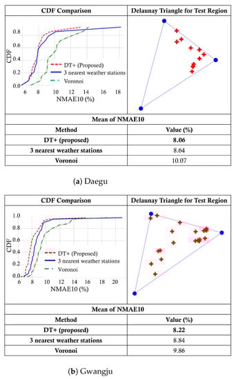 In the implementation of the union-inner triangles algorithm, we set the degree parameters to and . The choice of and is based on validation results of a comparison between DT weather stations and the three nearest weather stations, which shows the pattern of the specific locations of PV sites. As an example, Figure 9 shows the CDFs of NMAE10 for one of the Delaunay triangles in Daegu and Gwangju, respectively. As can be seen, our proposed method, denoted by DT+, outperforms the three-nearest weather stations and Voronoi in both cases by effectively selecting three relevant weather stations in the preprocessing step.