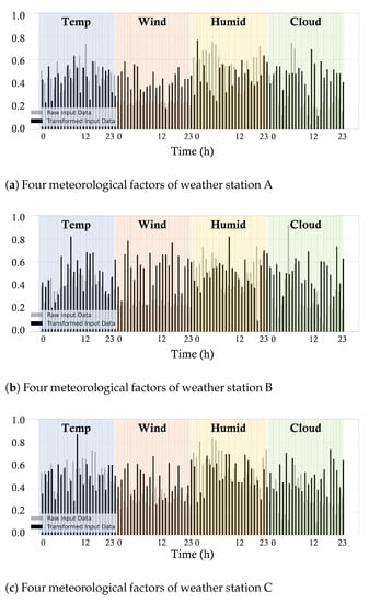 Thus far, we have discussed the selection of relevant weather stations. Now we discuss the forecasting model using the weather data from those weather stations. As shown in Table 2, the Transformer encoder is located in the first and the second layer of the TransGRU model, and it transforms input data into the feature domain. In other words, TransGRU learns input data for better representation and feed-forwards it to the recurrent learning task. In making an interpretable model, we compared the raw input data and transformed input data of three selected weather stations A, B, and C, as shown in Figure 10.