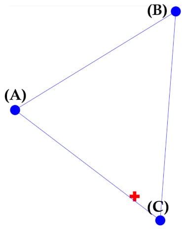 Now we present how to select relevant weather stations given a target PV site. One weather station can be used for PV forecasting if the PV site is in the corresponding Voronoi cell. This is a typical method used so far, i.e., choosing the nearest weather station. On the other hand, if the PV site is in the corresponding Delaunay triangle, three weather stations at the vertices of the triangle, called DT weather stations hereafter, can be used for PV forecasting. However, using DT weather stations may not be good depending on the position of the PV site as well as the shape of DT, specifically when DT is a very flat triangle, as can be seen in some regions of Figure 2b. In addition, DT weather stations can sometimes be very different from the three-nearest weather stations. Hence, we need to have a method that can discern whether to use DT weather stations or the three-nearest weather stations. The proposed algorithm considers the union set of DT weather stations and the three-nearest weather stations. The size of this union set can be either 3, 4, 5 or 6. When the size of the union set is 3, it implies that DT weather stations are also the three-nearest weather stations, which is an ideal case. By contrast, as can be seen in Figure 3, the size can be 4 or larger, depending on the shape of DT and the inside location of the PV site. To investigate this, we focus on three inner triangles in the DT and their interior angles; an obtuse DT is not favorable, nor are the obtuse inner triangles. Furthermore, when the PV site is close to a side, either of the three inner triangles becomes a severe obtuse triangle. To simply capture this, we want the interior angles, denoted by in Figure 3a, to not be less than some threshold; otherwise, the three-nearest weather stations are selected. This algorithm has the limitation that it is a heuristic way to select three weather stations; however, it can be the one of examples that captures the most relevant weather stations for PV power forecasting. The pseudo code of the proposed algorithm is summarized in Algorithm 1, and various cases are shown in Figure 3b.