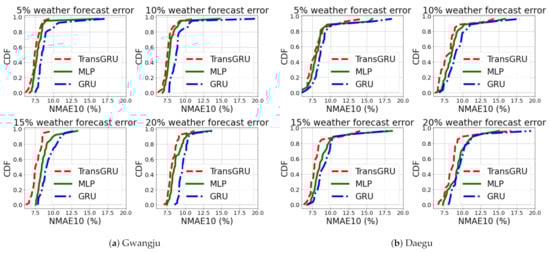 Figure 12 shows the CDF comparison of MLP, GRU and TransGRU in Gwangju and Daegu, respectively. As can be seen, the proposed TransGRU is located in the upper left for all weather forecast error cases. Furthermore, the performance gap between TransGRU and others becomes larger as the weather forecast error increases. In Figure 12b, as the weather forecast error goes from 5% to 20%, TransGRU further outperforms MLP and GRU. More specifically, for the 5% weather forecast error case, differences between TransGRU and MLP, GRU in terms of NMAE10 are 3.81% and 10.31%. For the 20% weather forecast error case, differences between TransGRU and MLP, GRU increase, which show 7.28% and 11.57%. In addition, the differences between the 5% and 20% weather forecast error cases for each MLP, GRU, and TransGRU itself are 12.72%, 10.20%, and 8.65%, which show TransGRU has the smallest decrease. This confirms that the Transformer encoder is robust for the weather forecast error. One may wonder why MLP is better than GRU. This is because GRU (or LSTM) requires more data to be effective, but, in our case, newly built PV sites do not have sufficient data.