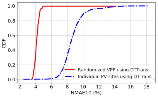Rather than simply aggregating PV sites colocated in some regions, one can consider the best combination of multiple PV sites based on meteorological satellite images, as done in [43]. We can seek a method to obtain the best combination of multiple PV sites, but since the proposed DTTrans is in parallel to constructing VPP, here we simply focus on randomized VPP construction; the randomized VPP may not be better than the best combination method, but it can capture the performance in the real field because VPP construction cannot always be performed at will. In Figure 13, we compare the CDFs of NMAE10 between the DT+-based VPP and individual PV sites. DT+-based VPP is constructed to meet the requirements in Korea; VPP capacity should be larger than 20MW, and capacities of each PV site should be lower than 1MW. In implementing this, we randomly select PV sites and aggregate them to make 200 VPPs. It shows that the DT+-based VPP substantially improves the performance from 8.7% to 4.2%. The CDF shown in Figure 13 clearly shows this improvement. Considering that the renewable energy wholesale market in Korea currently requires 6% or less forecasting error, the proposed method sufficiently satisfies this requirement.