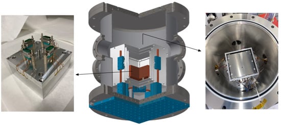 (Center): Vacuum chamber (dark gray) and thermal shields (light gray) drawing. The aluminium block where the sensors are placed is the central element, colored in brown. In blue, the water-cooled breadboard and heat pies used to extract the heat of the Peltier elements can be seen. (Left): Picture of the aluminium block hosting the sensors. (Right): Top view of the inside of the vacuum chamber.