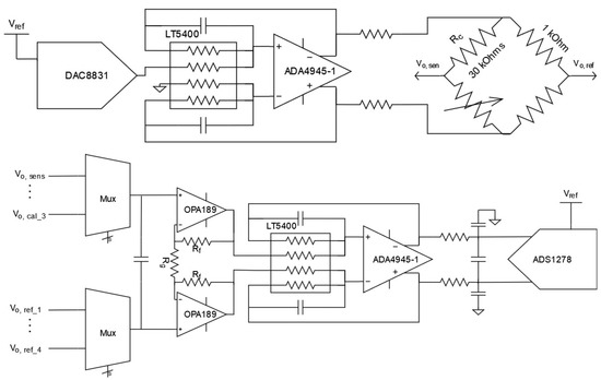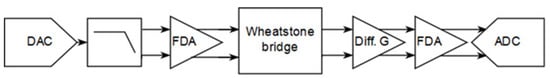 The first element is the DAC8831 Digital-to-Analog Converter (DAC) (Figure 2), which is controlled by an MCU (microcontroller unit) that runs the read-out software and generates the modulation stimulus signal. The voltage reference of the DAC and ADC (Analog-to-Digital Converter) are the same, that is, the system is ratiometric. Following this, the ADA4945-1 Fully Differential Amplifier (FDA) transforms the single-ended signal to a differential signal without any DC component. This balanced driving ensures that the common-mode and DC applied voltage is minimized, which is necessary to avoid an increase in the heat generated at the sensor. The FDA acts as an active low-pass filter, removing the stairs-like signal related to updating the output of the DAC. Because this is done each time a new sample is received from the ADC, this filter is a low-pass one with a kilohertz cut-off frequency.