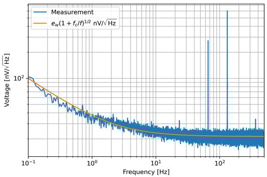 As introduced before, we need to generate a modulation signal in order to move the sensor response to a higher frequency region with a lower noise floor. The selection of the frequency is a trade-off between the 1/f noise, the desired measurement bandwidth, and the effects introduced by the wires to the sensors. This last point can become highly relevant in missions such as LISA, where it the wires can be expected to be from a few to tens of meters. The effect of the parasitic capacitances of wires, boards, and connectors, along with their high dependence on the ambient temperature, can severely impact the measurements, and the seriousness of this issue increases with the modulation frequency. These effects can be minimised in part by analysing only the in-phase component, although this does not completely avoid the problem. Therefore, we characterized the noise of the full chain using the zero calibration position of the multiplexer, which has a high-stability resistor with a similar value to that of the sensor at the center of the scale. As can be seen in Figure 4, the pink noise corner frequency is about 2 Hz. This is because the operational amplifiers and ADC used here are chopper-stabilized; therefore, in principle their pink noise contribution is negligible. The only element contributing is the FDA; as we describe later, this noise is divided by the gain of the input stage, and appears only at very low frequencies. Considering all these issues, we decided to use a nominal modulation frequency of about 10 Hz for our measurements.