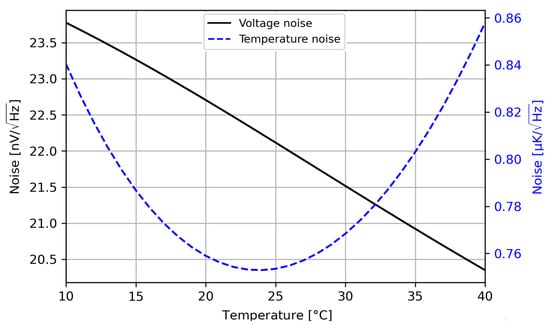 The full chain noise was theoretically analysed using the values of the datasheets of the different components and compared with experimental results. All the noise values used in this section always refer to the input of the chain, i.e., in reference to the sensor itself, and are converted to temperatures with a full expression similar to Equation (2). In addition, when adding different noise sources, we consider all of them uncorrelated; hence, we use the square root of the sum of squares.