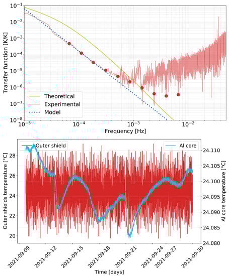 Evaluation of the thermal transfer function of the test bench. (Top): Experimental estimation of the thermal transfer function; the dots mark the frequencies where temperature injections were applied and the dotted line shows the fit (labeled as Model) to these frequencies. (Bottom): Detail of the time series during the evaluation of the test bench thermal transfer function; the temperature measured in one sensor of the Al core appears strongly suppressed when compared to the measurement in the outer shield.